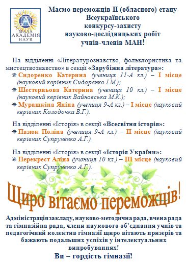 - Наказ №345 від 01.12.2014р. «Про підсумки участі учнів гімназії у І (районному) етапі Всеукраїнського конкурсу-захисту науково-дослідницьких робіт учнів-членів МАН України у 2014-2015н.р.»