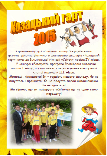 14 травня у Вільнянській гімназії «Світоч» проводився фінальний тур обласного етапу Всеукраїнського фізкультурно-патріотичного фестивалю школярів «Козацький гарт». Гімназія приймала у себе команди-учасниці, які стали переможцями районного етапу Фестивалю, з різних куточків області: Бердянська загальноосвітня школа І-ІІІ ст. № 11, Енергодарський НВК № 5, Запорізький НВК «Основа», Мелітопольський НВК № 16, Пологівський колегіум № 1 та Вільнянська ЗОШ І-ІІІ ст. № 3.