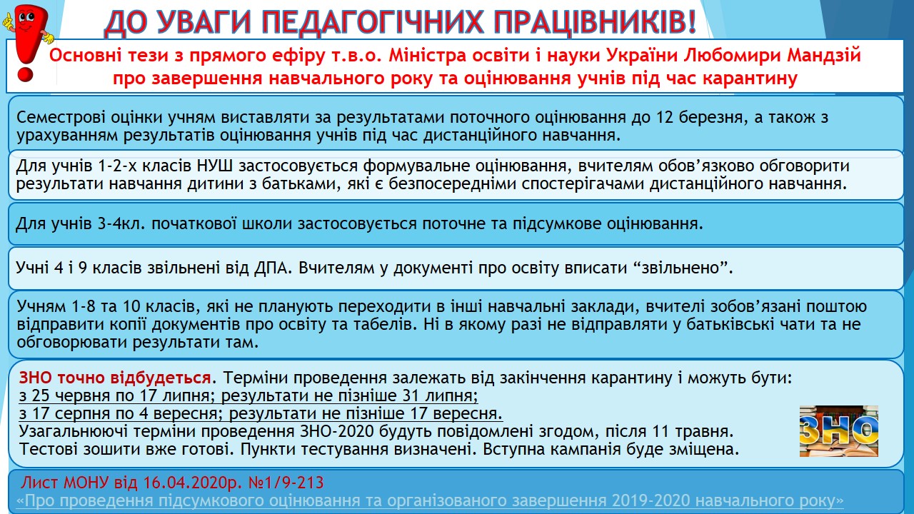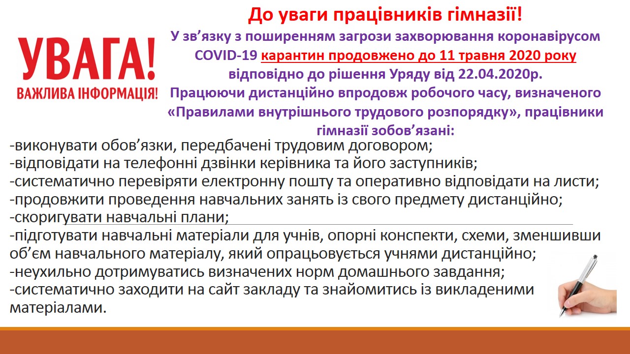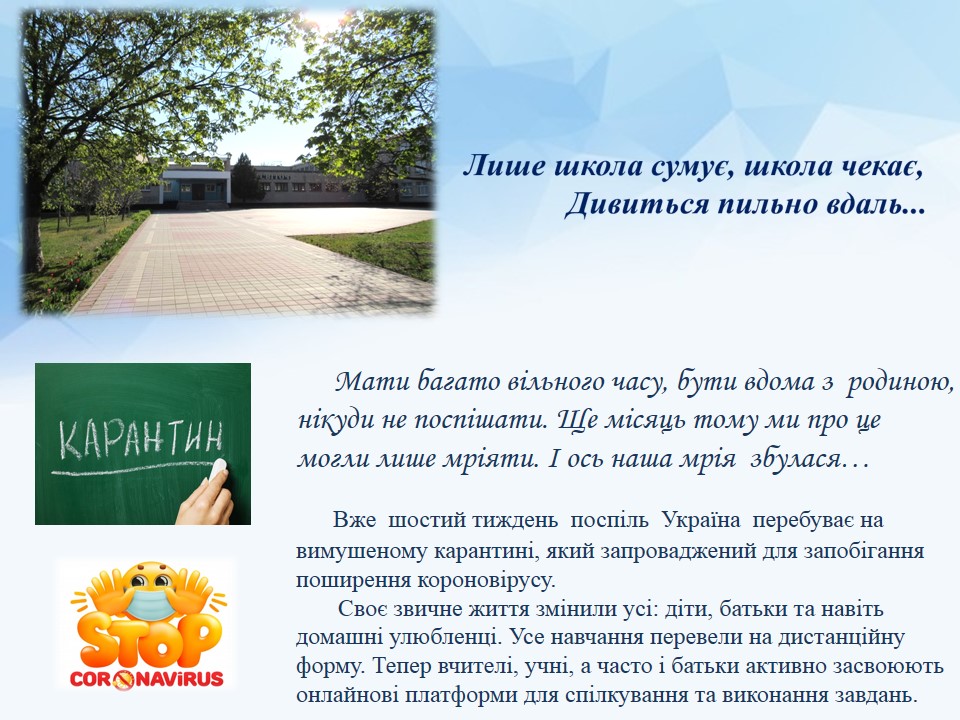 На час карантину ведеться дистанційне навчання для учнів 2-11 класів по всіх предметах. Класні керівники та учителі-предметники висилають завдання на телефони батьків по Viber або розміщують їх на нашому сайті у розділі "Дистанційне навчання" .