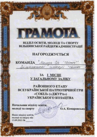 | Готували команду "Світоча" до участі у грі "Джура" вчителі: Москаленко І.О.,Колодочка В.Г.,Негрей В.Г.,Худяков О.В., Яценко О.О., Кузьменко І.О., Миланко М.С., Сидоренко І.М., Супруненко А.Г., Рожко О.І., Опашко І.В., Юнацька І.В., Сидор Т.В., Михайленко Н.І., Ворожейкіна Я.О. | |
